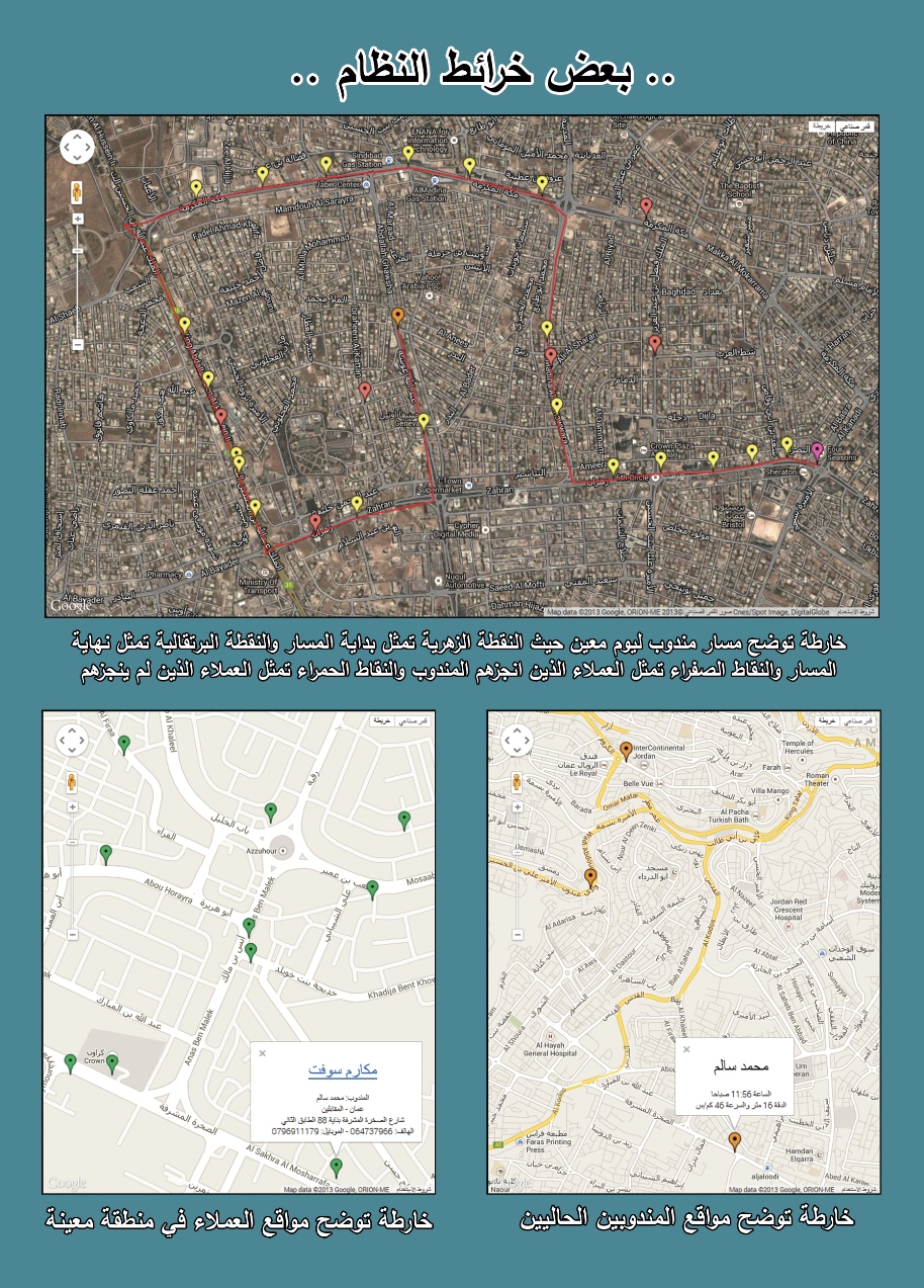 • معرفة مواقع المندوبين الحالية ومعرفة مسار عملهم اليومي وإظهاره على الخارطة مع اظهار مواقع العملاء الذين تم زيارتهم على مسار المندوب على الخريطة